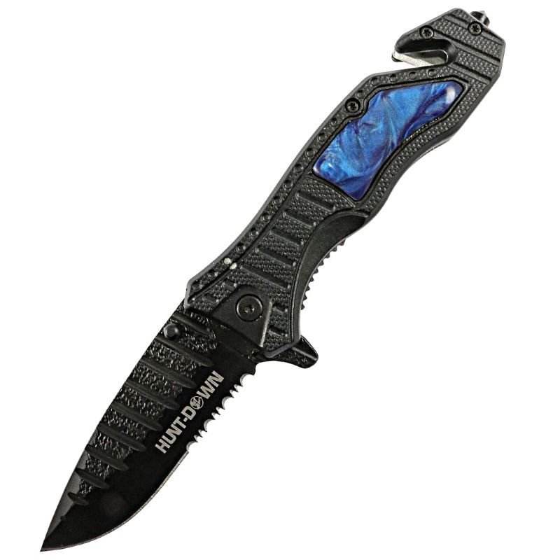 Hunt-Down 8.5″ Blue spring assisted folding knife Belt Cutter Glass Breaker 3CR13 Steel